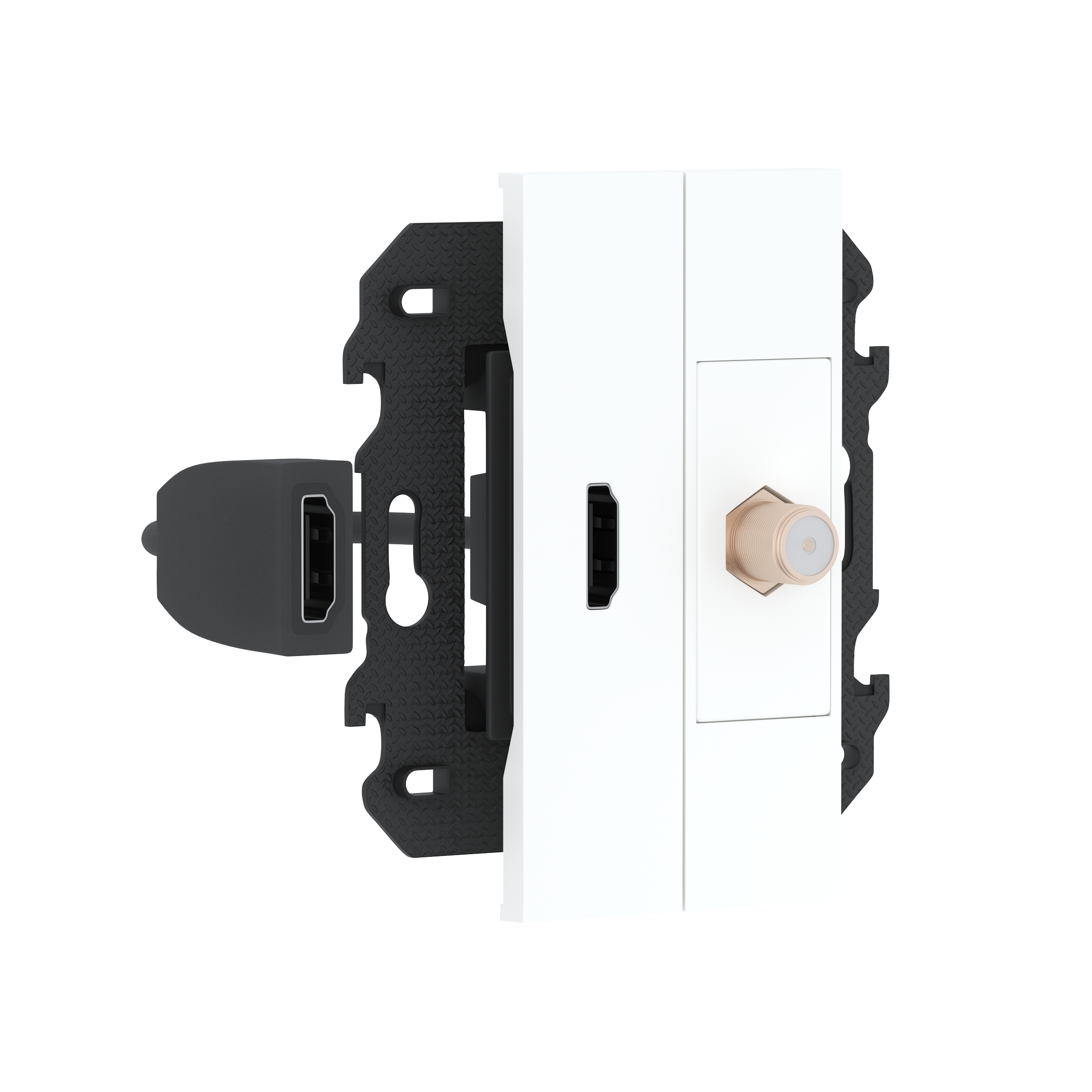 Розетка комбинированная HDMI с подключённым разъёмом + TV/SAT простая с F-разъёмом, в сборе с суппортом, цвет белый матовый
