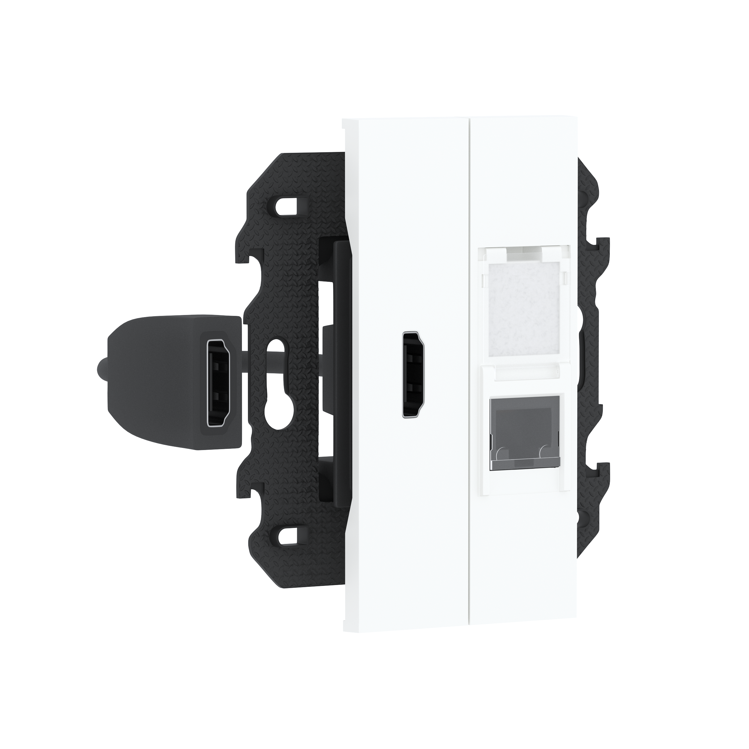 Розетка комбинированная HDMI с подключённым разъёмом + компьютерная RJ45 cat5e UTP, в сборе с суппортом, цвет белый матовый